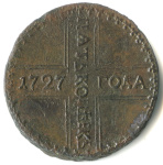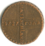 5 копеек (Регулярный выпуск) 1727 КД «АКЬ». Шведский орел. После запрещения хождения пятикопеечников «IKЬ», кроме переделанных в «Е» штемпелей реверса, появились и новорезанные «АКЬ». Редкая