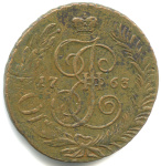 5 копеек — Вензель императрицы Екатерины II Великой. Орел 1763 г. Екатеринбург 1768 ЕМ