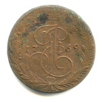 5 копеек — Вензель императрицы Екатерины II Великой. Орел 1768 г. Екатеринбург 1769 ЕМ