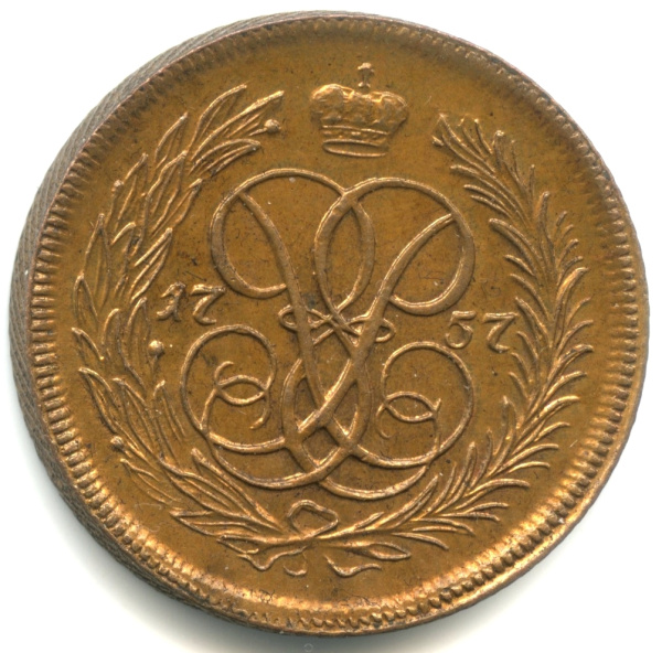 2 копейки (Регулярный выпуск) 1757. Перечекан с облачной копейки ММД 1755 года. Крайне редкая в подобной сохранности (Российская Империя)