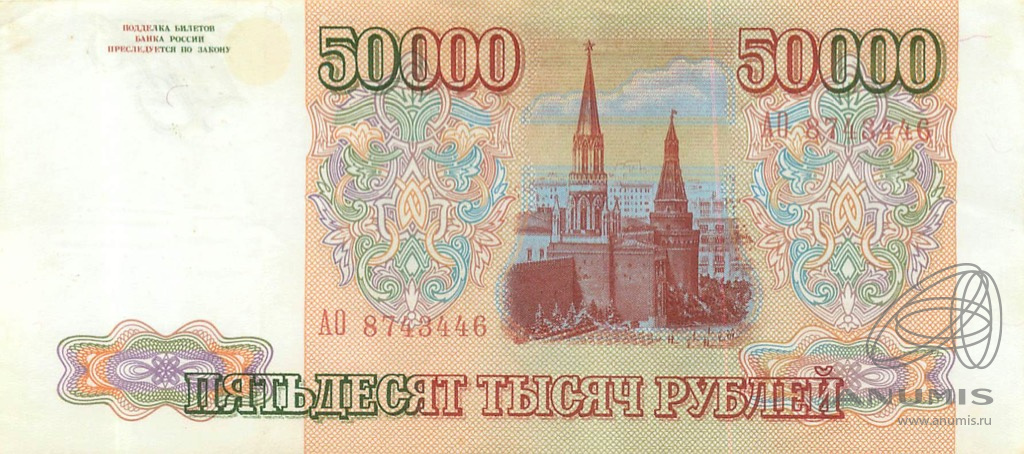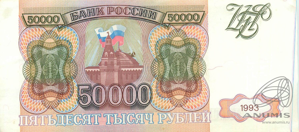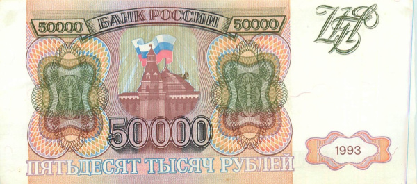 Банкнота регулярного выпуска: 50000 рублей 1993 года. Билеты Банка России 1993 г. Российская Федерация: Банк России (1992 — 1996).