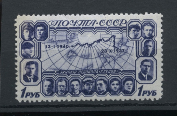 Негашёная марка «Карта дрейфа ледокольного парохода „Георгий Седов“. Портреты членов экипажа», **. стоимость по каталогу Загорского ред.2023 г. = 1 500 руб. для **