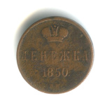 В центре указан номинал — надпись «ДЕНЬГА». Над обозначением номинала — шестиконечная звезда. Над ней — императорская корона. Под надписью — прямая черта, под ней — обозначение монетного двора «Е.М.». Вдоль канта, не доходя до короны, изображен венок из лавровой и дубовой ветви, которые в нижней части переплетены лентой. По окружности канта имеются рельефные элементы, выполненные в виде точек.