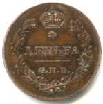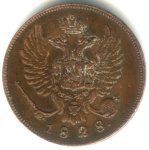 Монета регулярного выпуска: Деньга (½ копейки) 1828 года «Орел 3 типа: Обычный». Деньга 1810 — 1828 гг. Российская Империя: Николай I (1825 — 1855). Монетный двор: Екатеринбургская монета, г. Екатеринбург. Минцмейстер: Иван Иванович Колобов (1825−1830). Медь, 3 г, ø 18 мм, Гурт: Гладкий.