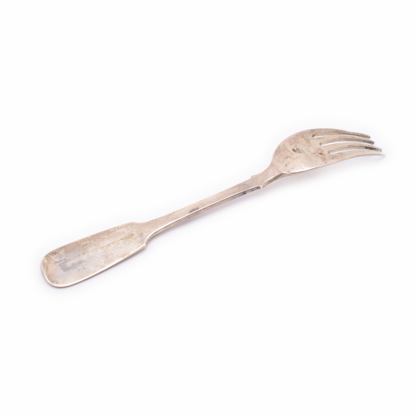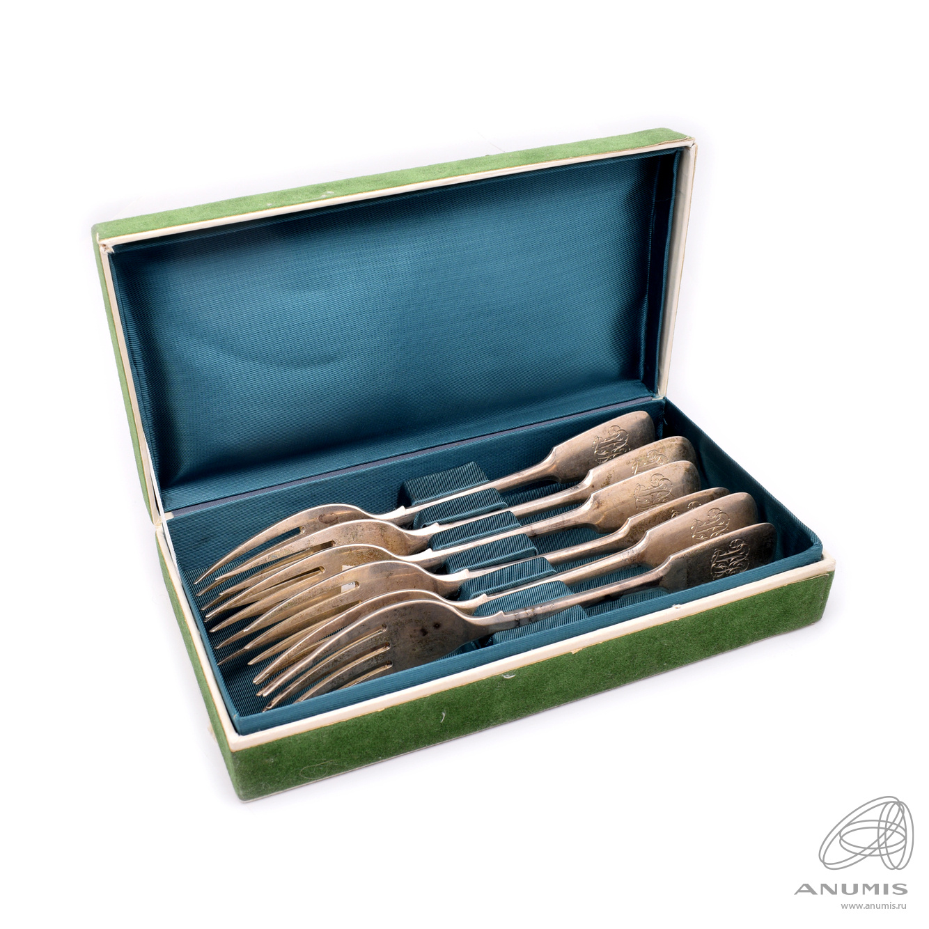 Набор столовых вилок. 6 штук. В коробке. Длина 21 см. И. ОЗЕРИЦКIЙ. Серебро 84 пробы. 482,59 г