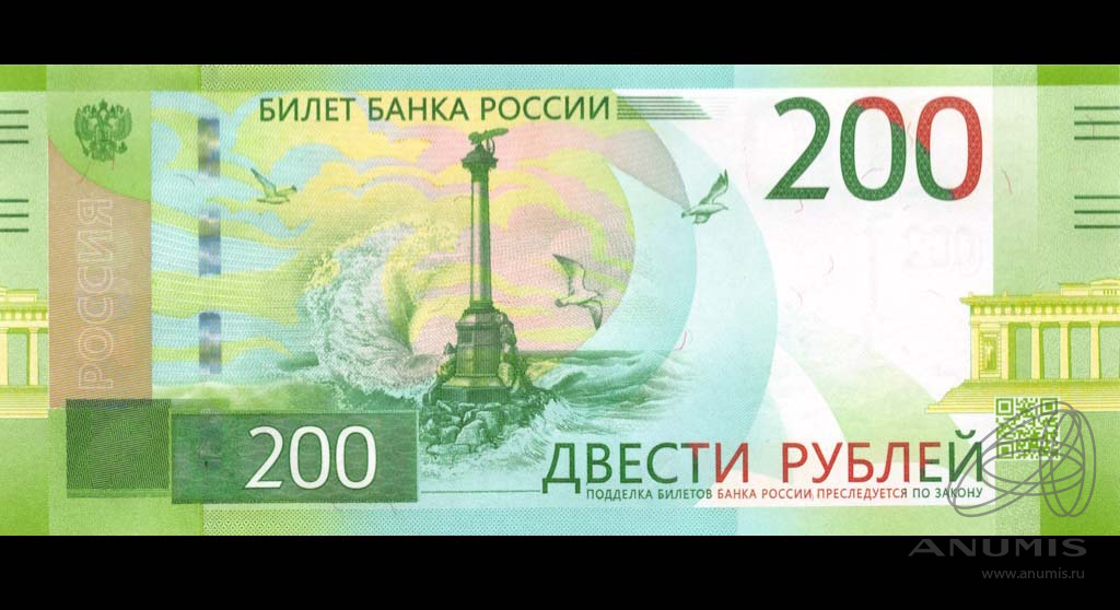 Банкнота регулярного выпуска: 200 рублей 2017 года. Билеты Банка России 2017 г. Российская Федерация: Россия современная (1997 — 2020).
