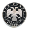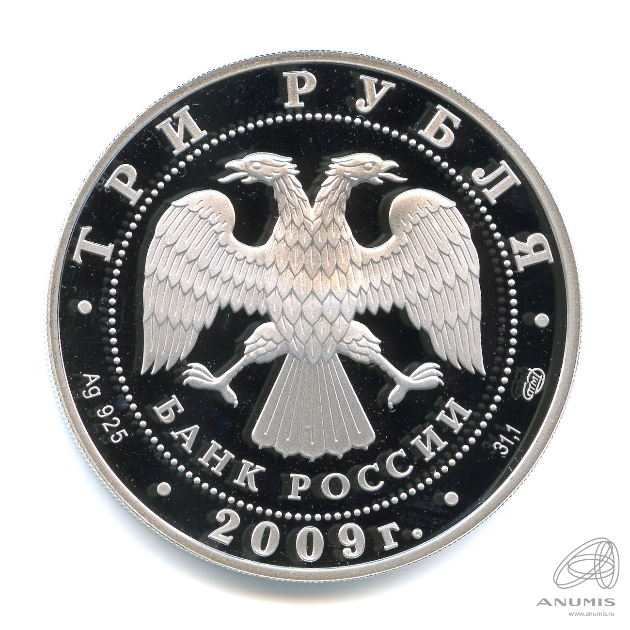 В центре — эмблема Банка России (двуглавый орёл с опущенными крыльями, под ним — надпись полукругом «БАНК РОССИИ»), обрамленная кругом из точек и надписями по кругу — вверху: «ТРИ РУБЛЯ», внизу: слева — обозначения драгоценного металла и пробы сплава, в центре — дата выпуска «2009 г.», справа — содержание химически чистого металла и товарный знак монетного двора