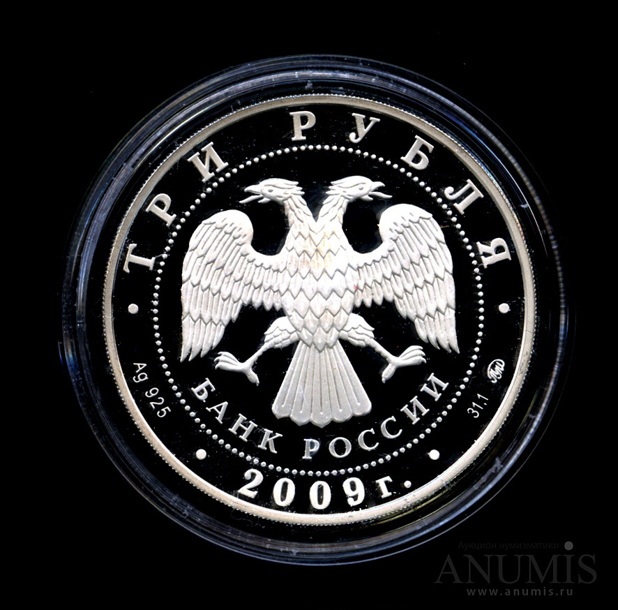 в центре диска — эмблема Банка России (двуглавый орел с опущенными крыльями, под ним — надпись полукругом «БАНК РОССИИ»), обрамленная кругом из точек и надписями по кругу — вверху: «ТРИ РУБЛЯ», внизу: слева — обозначения драгоценного металла и пробы сплава, в центре — дата выпуска «2009 г.», справа — содержание химически чистого металла и товарный знак монетного двора.Реверс