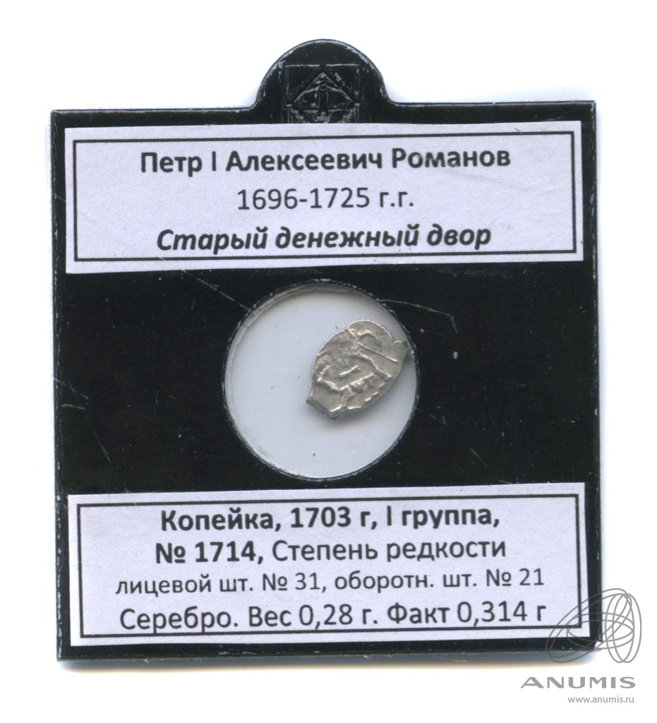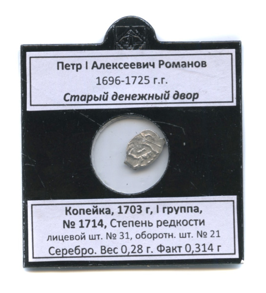 1 копейка KG# 1714, GKH# 1281 (Регулярный выпуск) (KG# 1714, GKH# 1281) 1703. В холдере. вес 0,28 г. Петр I Алексеевич Романов (1696−1725 гг.) Старый денежный двор. Степень редкости, лицевой шт. № 31, оборотн. шт. № 21 Серебро