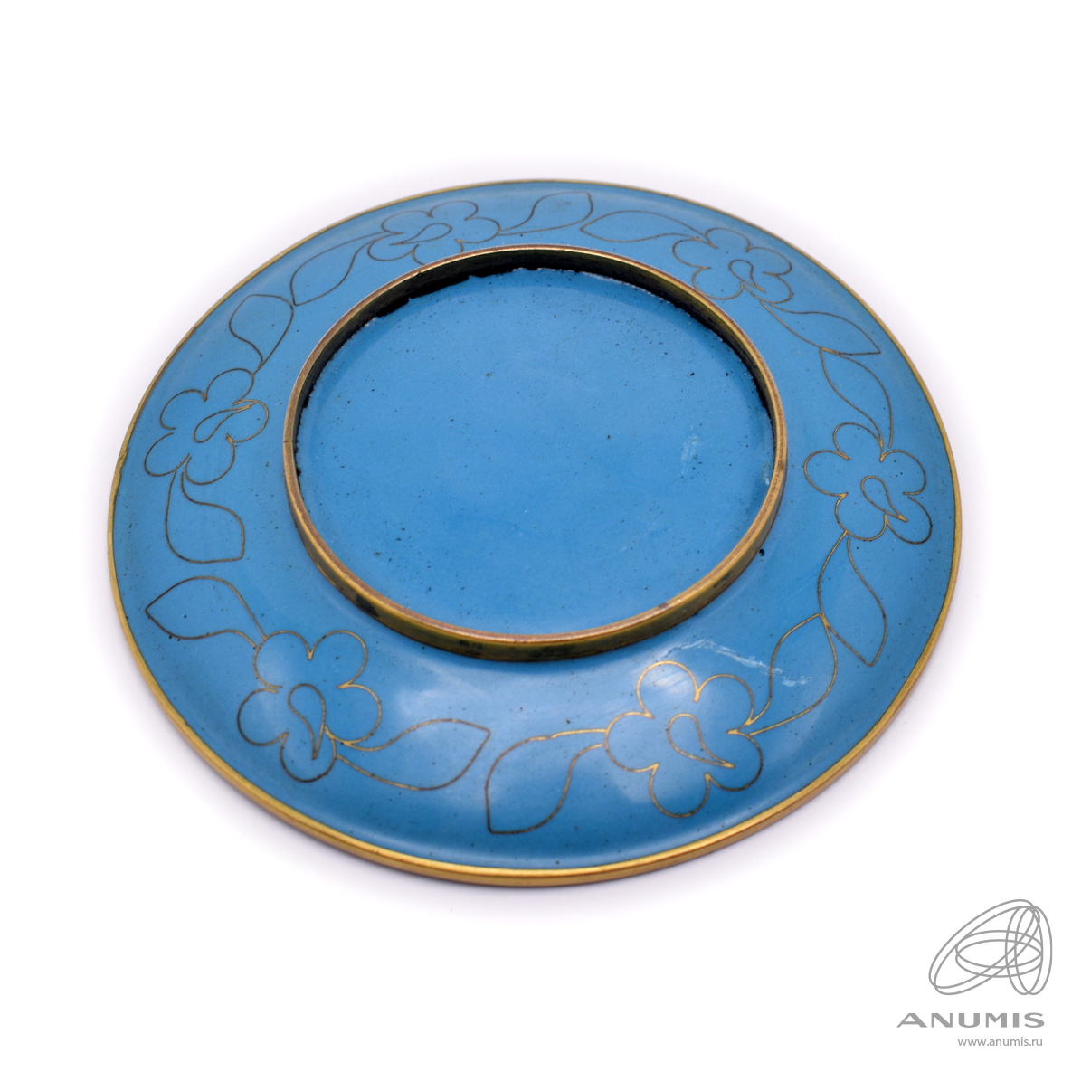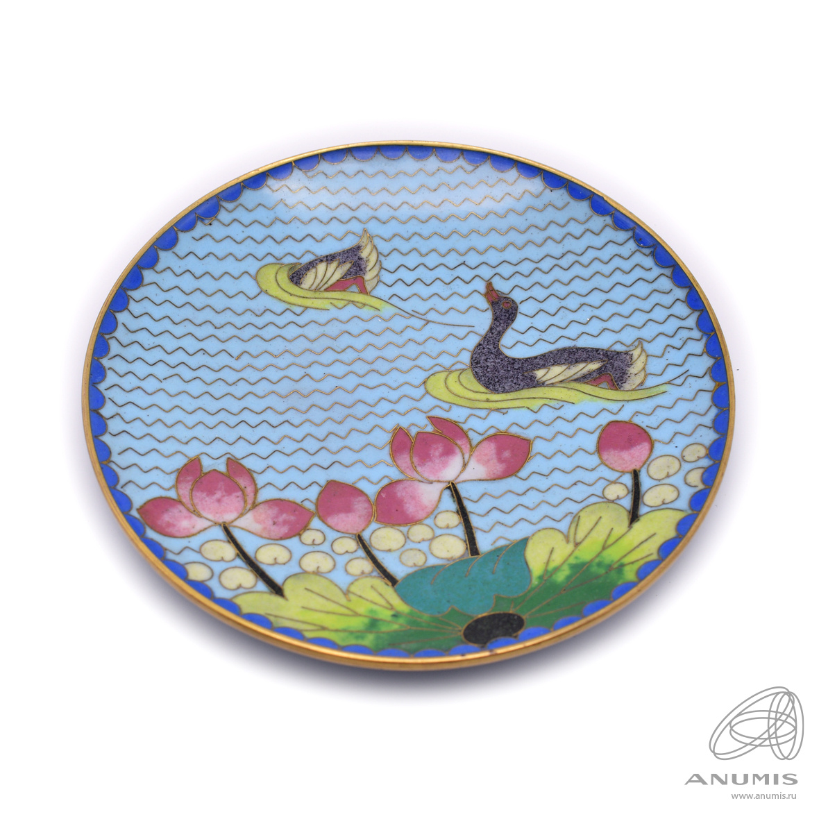 Тарелка в технике клуазоне (перегородчатая эмаль) «Сцена с двумя утками среди цветущих лотосов и листьев». ⌀ 11 см