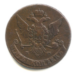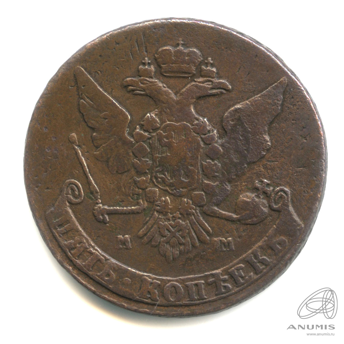 Монета регулярного выпуска: 5 копеек 1764 года «Вензель императрицы Екатерины II Великой. Москва». 5 копеек 1763 — 1796 гг. Российская Империя: Екатерина II (1762 — 1796). Монетный двор: Московская монета, г. Москва. «Красный МД». Медь, 51 г, ø 42−43 мм, Гурт: Узор.