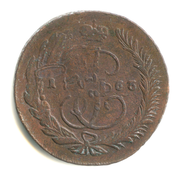 В центре изображён вензель Екатерины II. Над вензелем — императорская корона. По обеим сторонам от вензеля цифры даты выпуска монеты: слева — «17», справа — «63» (1763 год). Вокруг центрального изображения, вдоль канта, изображён венок из лавровой и пальмовой ветвей, которые, в нижней части, перевязаны лентой на узел бантом.