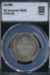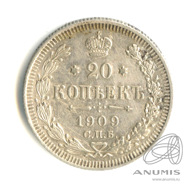 Монета регулярного выпуска: 20 копеек 1909 года «Орел 4 типа». 20 копеек 1859 — 1917 гг. Российская Империя: Николай II (1894 — 1917). Монетный двор: Санкт-Петербургский монетный двор, г. Санкт-Петербург. Минцмейстер: Эликум Иванович Бабаянц (1906−1913). Серебро 500, 4 г, ø 22 мм, Гурт: Рубчатый. Тираж: 18875011 шт.