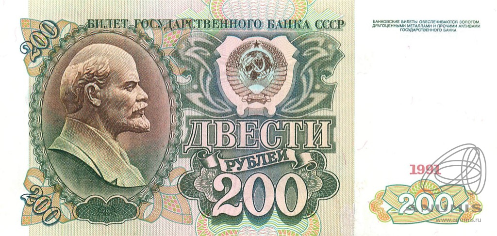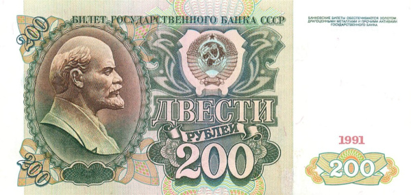 Банкнота регулярного выпуска: 200 рублей 1991 года. Билеты Государственного Банка СССР 1991 г. Союз Советских Социалистических Республик: Госбанк СССР (1991 — 1992).