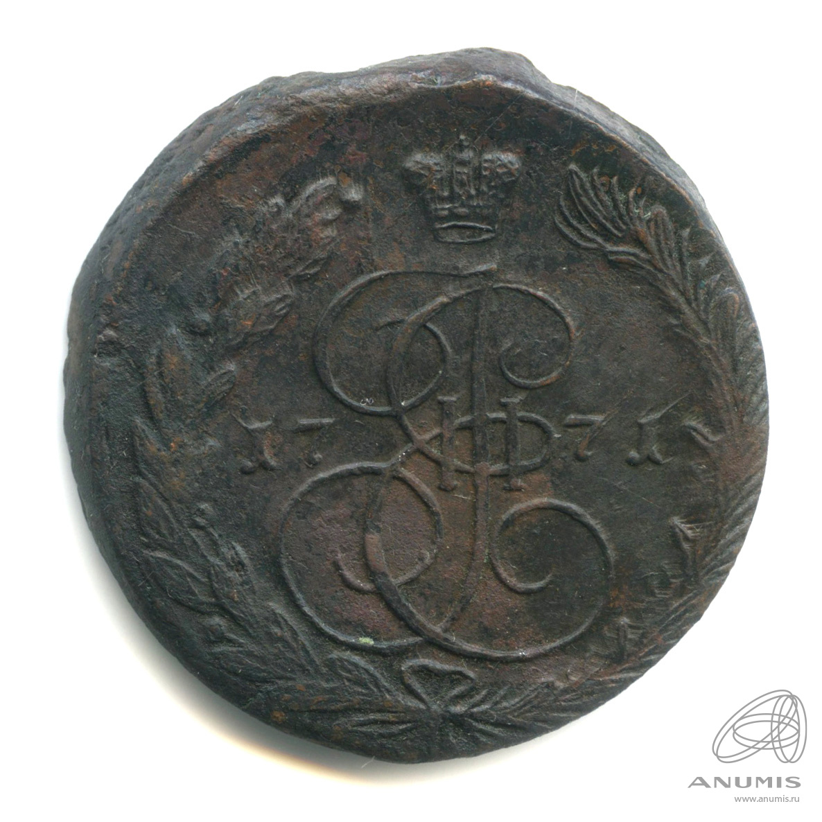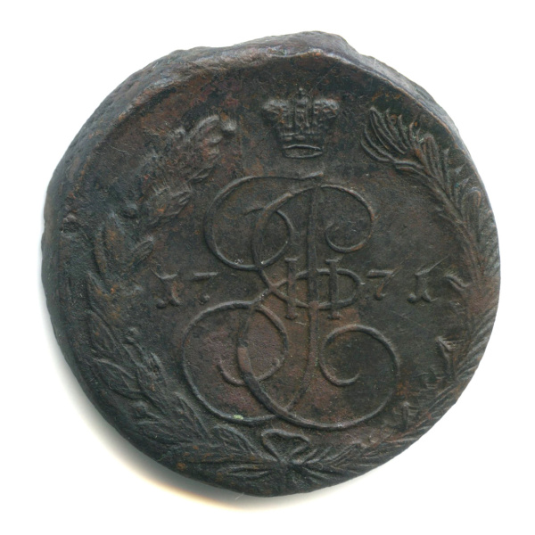 Монета регулярного выпуска: 5 копеек 1771 года «Вензель императрицы Екатерины II Великой. Орел 1768 г. Екатеринбург». 5 копеек 1763 — 1796 гг. Российская Империя: Екатерина II (1762 — 1796). Монетный двор: Екатеринбургская монета, г. Екатеринбург. Медь, 51 г, ø 42−43 мм, Гурт: Узор. Тираж: 57053400 шт.