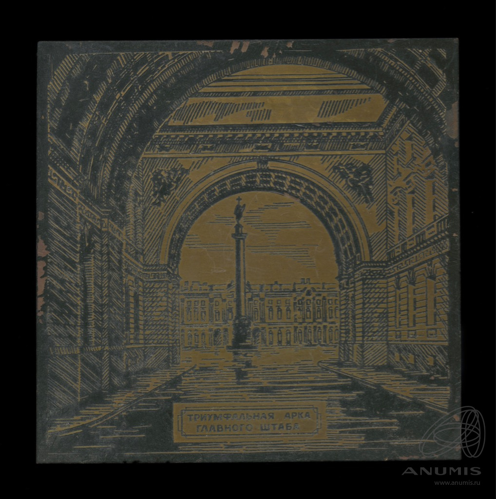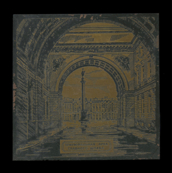 Панно «Триумфальная арка Главного штаба в Ленинграде». Резьба по металлу. Размер 10,5×10,5 см