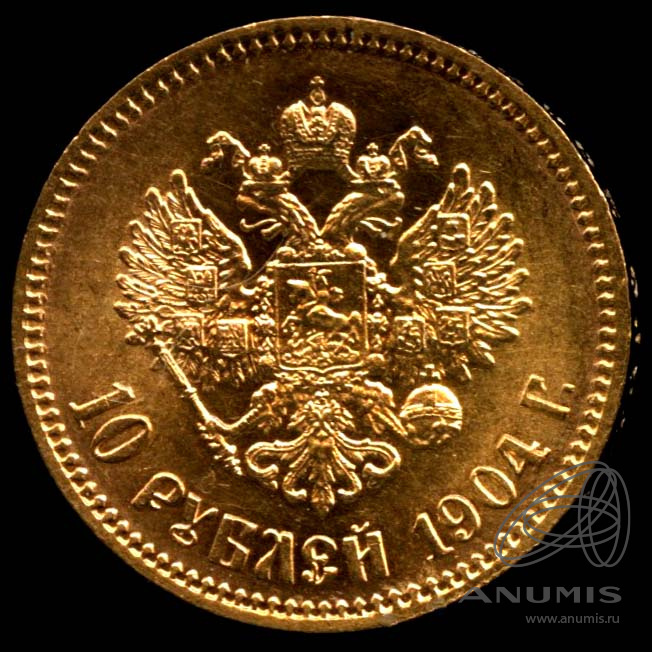 Монета регулярного выпуска: 10 рублей 1904 года «Портрет Николая II». 10 рублей 1898 — 1911 гг. Российская Империя: Николай II (1894 — 1917). Минцмейстер: Александр Григорьевич Редько (1901−1905). Золото 900, 9 г, ø 23 мм, Гурт: Надпись. Тираж: 1024510 шт.
