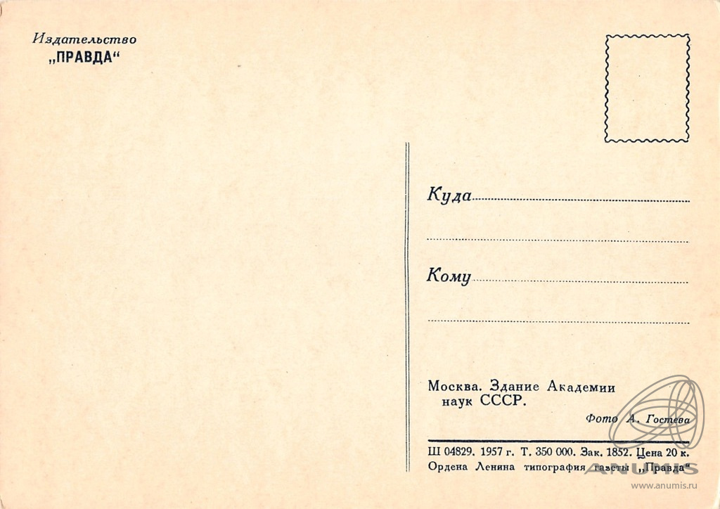 Карточка почтовая «Москва. Здание Академии наук СССР». Издательство «Правда», г. Москва. Тираж 350000 экз