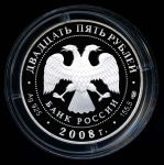 в центре — эмблема Банка России (двуглавый орёл с опущенными крыльями, под ним — надпись полукругом «БАНК РОССИИ»), обрамленная кругом из точек и надписями по кругу — вверху: «ДВАДЦАТЬ ПЯТЬ РУБЛЕЙ», внизу: слева — обозначения драгоценного металла и пробы сплава, в центре — дата выпуска «2008 г.», справа — содержание химически чистого металла и товарный знак монетного двора.