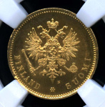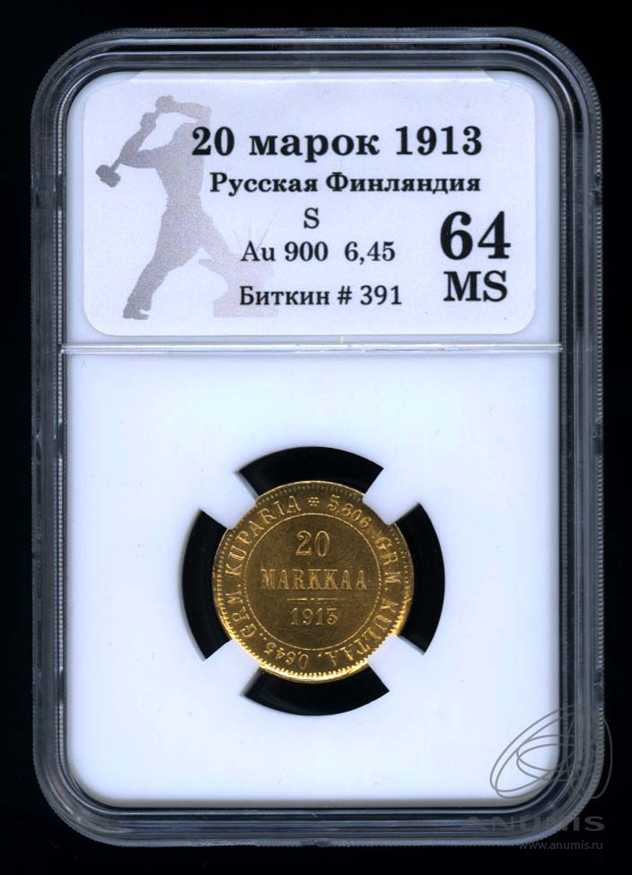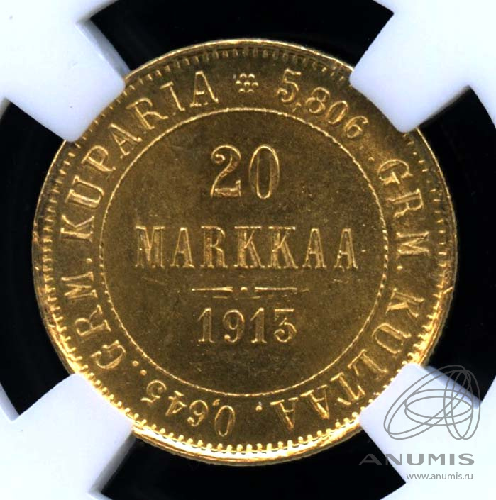 Монета регионального выпуска: 20 марок 1913 года «Для Финляндии». 20 марок 1878 — 1913 гг. Российская Империя: Николай II (1894 — 1917). Золото 900, 6 г, ø 21 мм, Гурт: Рубчатый. Тираж: 214000 шт.