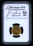 20 марок — Для Финляндии 1913 S. В оригинальном сертифицированном слабе® MS 64