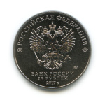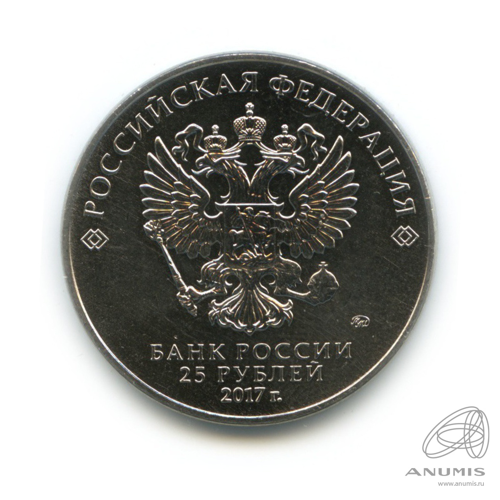 в центре — рельефное изображение Государственного герба Российской Федерации, над ним вдоль канта — надпись полукругом: «РОССИЙСКАЯ ФЕДЕРАЦИЯ», обрамленная с обеих сторон сдвоенными ромбами, под гербом в центре в три строки — надпись: «БАНК РОССИИ», номинал монеты: «25 РУБЛЕЙ», год выпуска: «2017 г.», справа — товарный знак монетного двора.